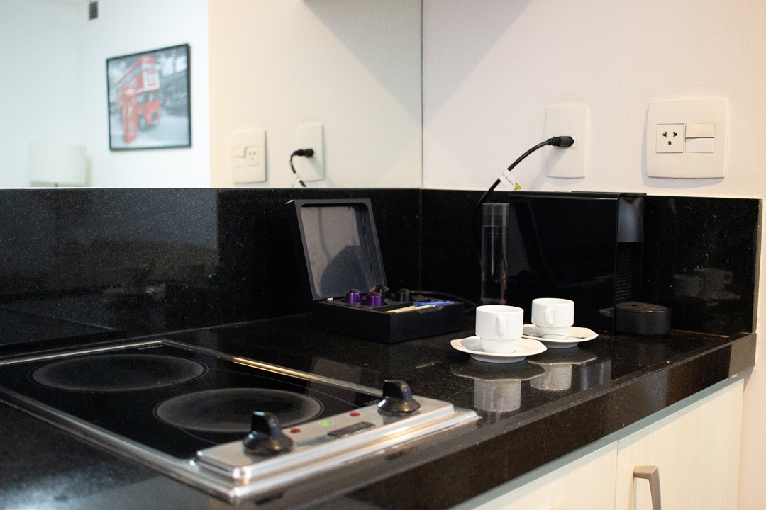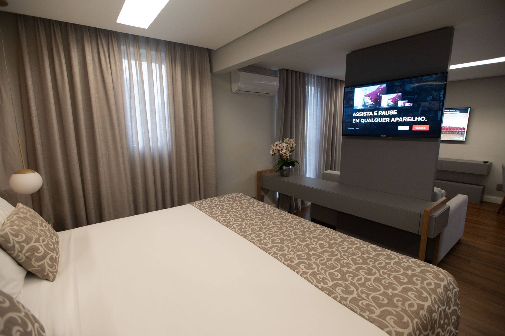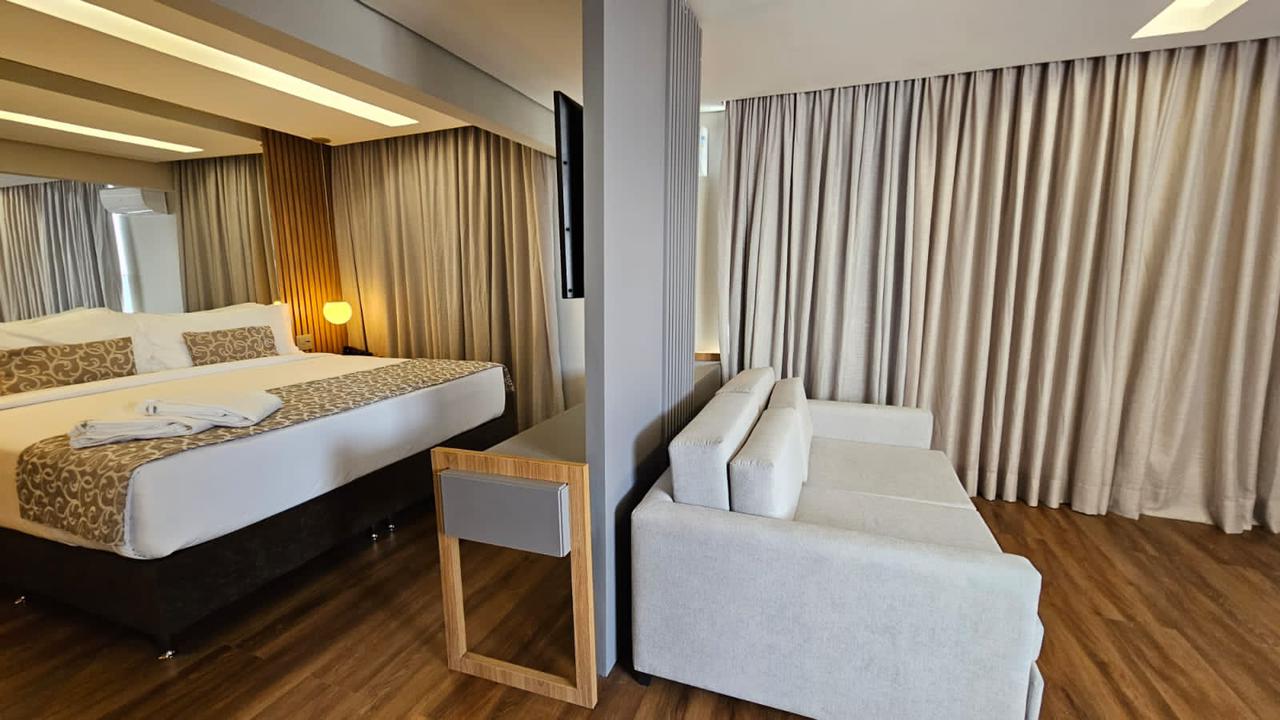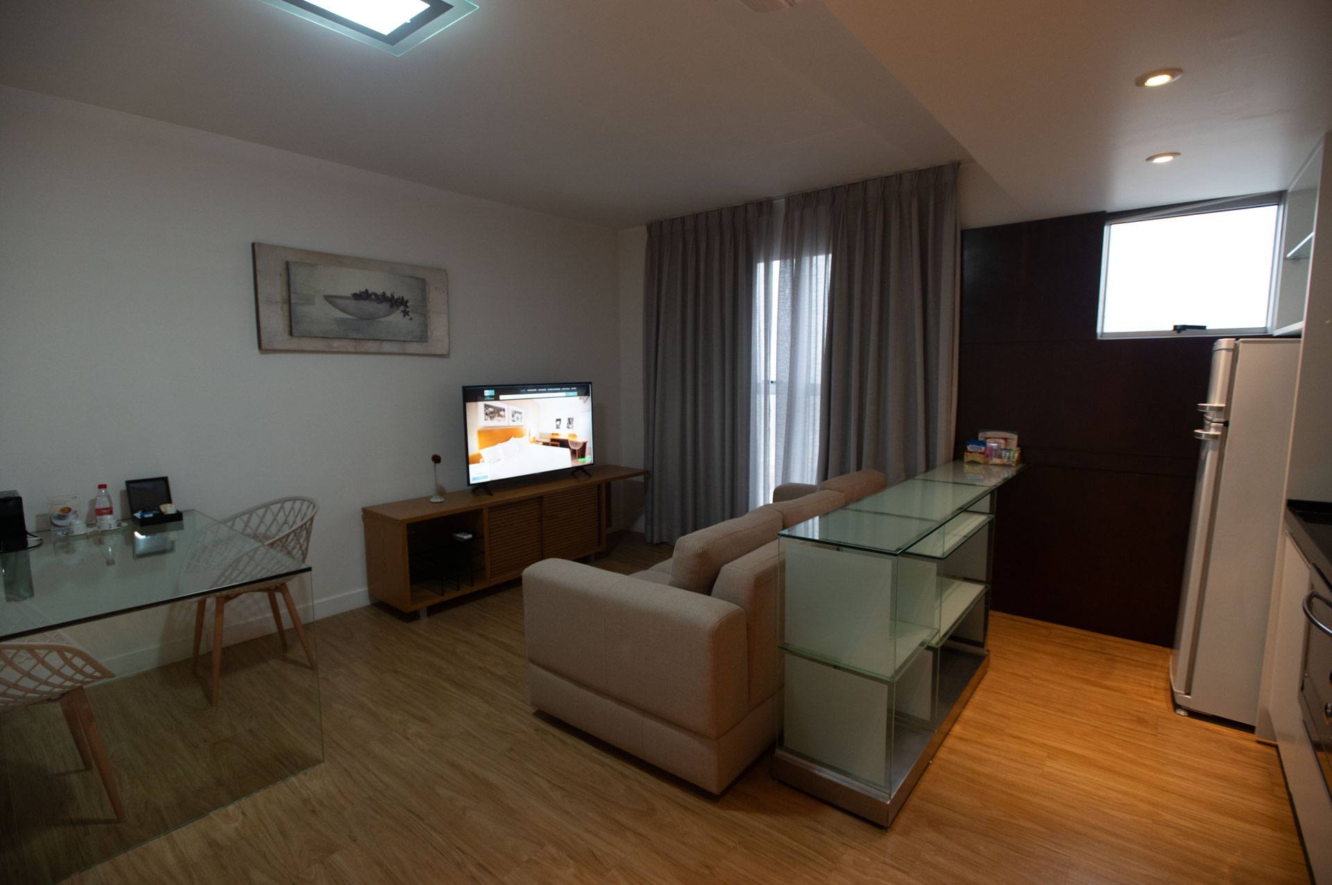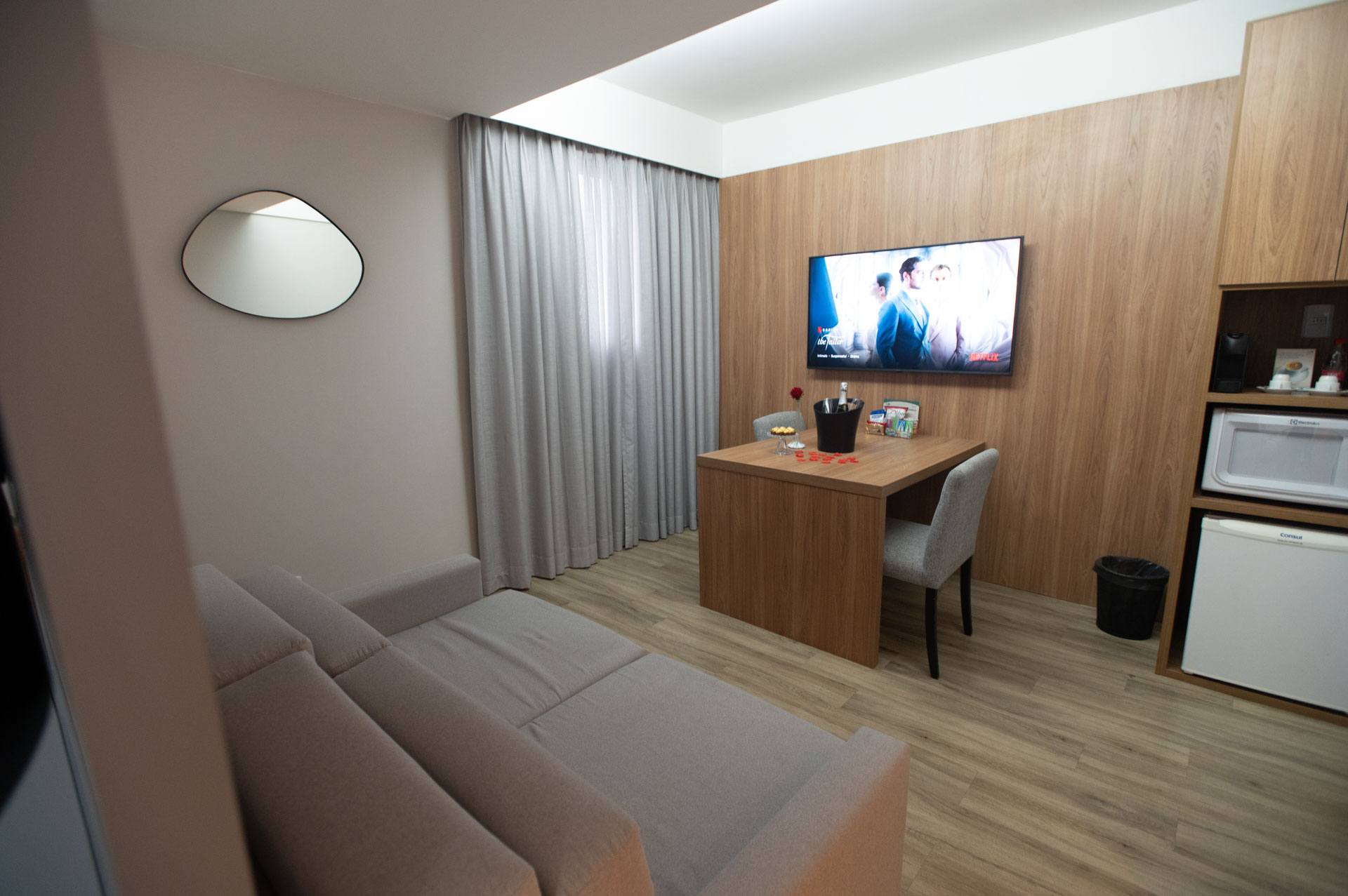 Esta categoria disponibiliza as seguintes comodidades extra: Máquina de café expresso, mini cozinha, sala de estar com TV Smart 50" 4K, roupas de cama 100% algodão, edredom com Duvet e acomoda 01 cama extra com custo adicional a cada diária, e deverá ser solicitada com 24h de antecedência ao check-in.